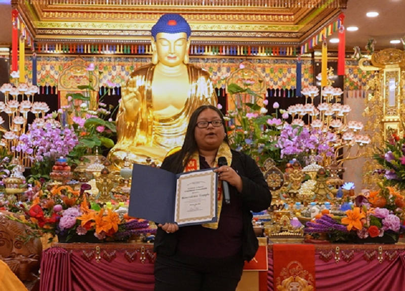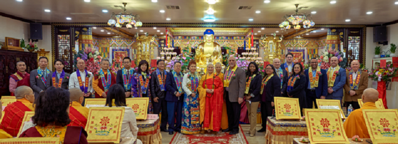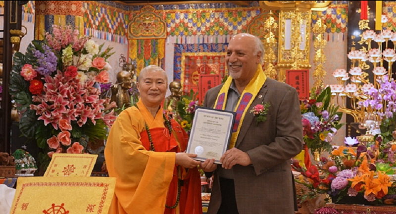 內華達州副州長Stavros S.Anthony頒贈賀狀給慈善寺,左為世界佛教總部副主席釋證達教尊。