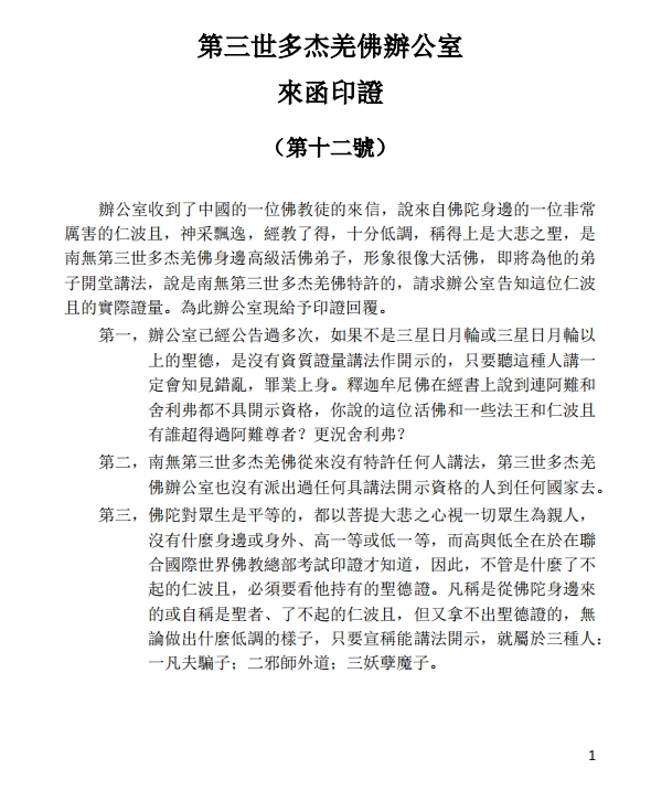 第二,南無第三世****從來沒有特許任何人講法,第三世****辦公室也沒有派出過任何具講法開示資格的人到任何國家去。