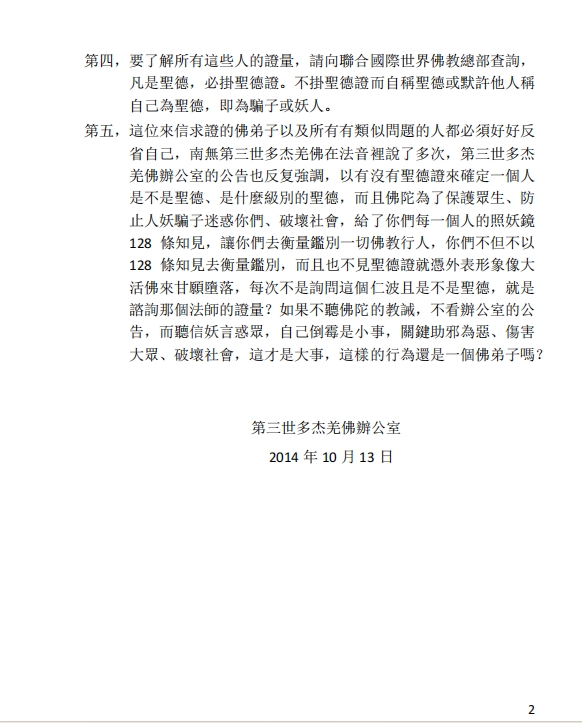 第四,要了解所有這些人的證量,請向聯合國際世界佛教總部查詢,凡是聖德,必掛聖德證。不掛聖德證而自稱聖德或默許他人稱自己為聖德,即為騙子或妖人。