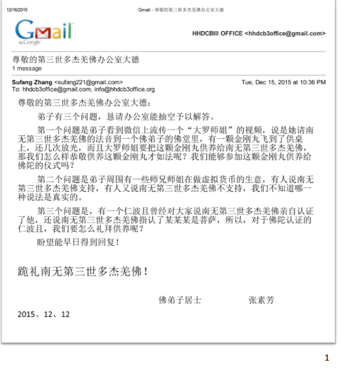 至於來信說某某人是南無第三世****認證的仁波且,還說某某某是一個菩薩,也是南無第三世****指認的,南無第三世****說:“有人自稱說我認證他是仁波且的問題,辦公室的公告和來函印證早已說得很清楚,大家要記住,我再次說一遍:我沒有認證過任何一個仁波且,也沒有指認過誰是菩薩,你們知道這是為什麼嗎?是我很了不起嗎?不是!因為我本身就是一個很普通的人,除了慚愧的行持,有什麼資格指認他人是什麼轉世呢?如果非要強行說是我給他認證的,那就請拿出我寫的認證書來,鑒別我的指紋印吧。我今天明確地說,不說是我沒有認證,就算是那些具資格認證的人,我還不會認同呢!他憑什麼是仁波且?他憑什麼是菩薩?以什麼為依據?經什麼考試的?資質何在?我是認同一種修行者,那就是以釋迦教法行持,諸惡莫作,眾善奉行,脫離神奇怪論,去掉自私我執,大慈大悲,利益眾生。千萬不要相信那些掛了傳承、掛了轉世、掛了銜頭就是聖,他們是在騙你們,當今的騙子太多了。”